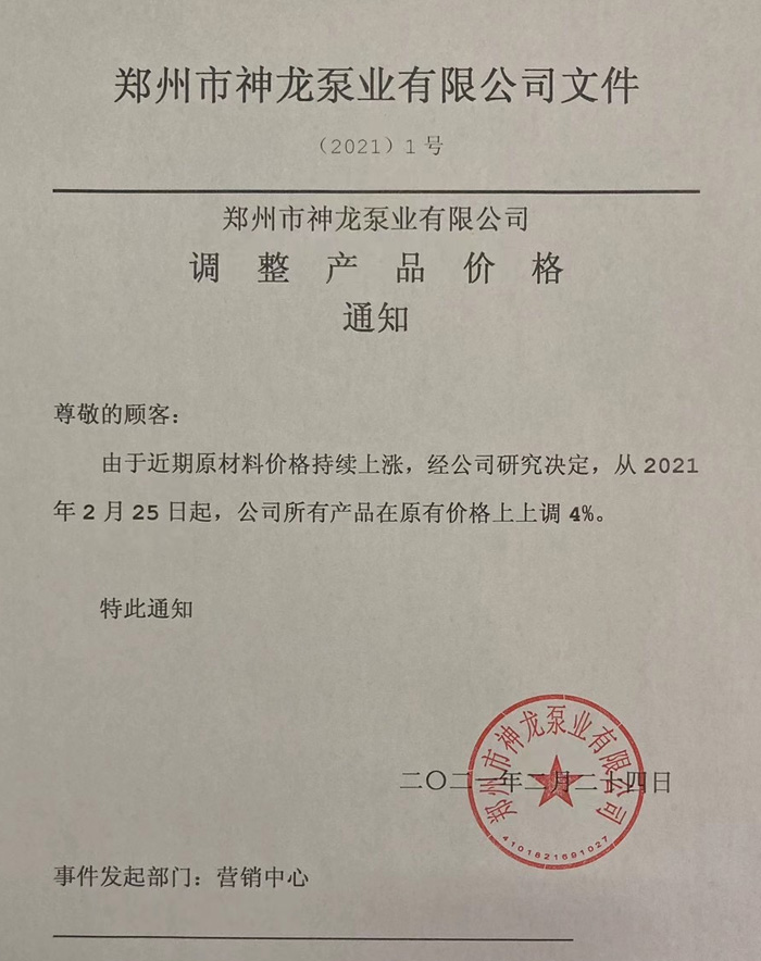本公司所有產(chǎn)品于2021年3月1日起在12月15日調(diào)價的基礎(chǔ)上銷售價格再次上調(diào)4%