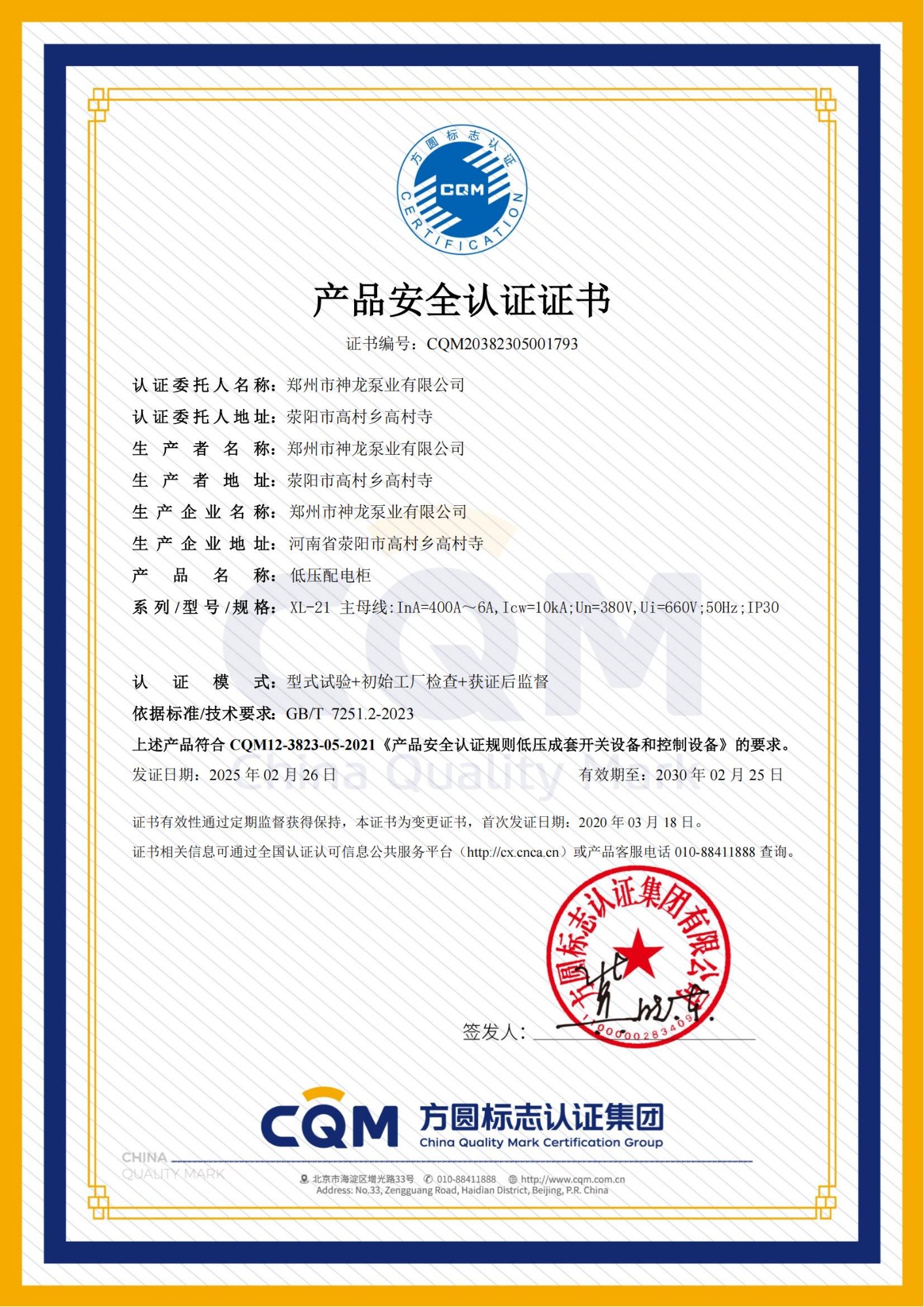 低壓配電柜產(chǎn)品認(rèn)證證書