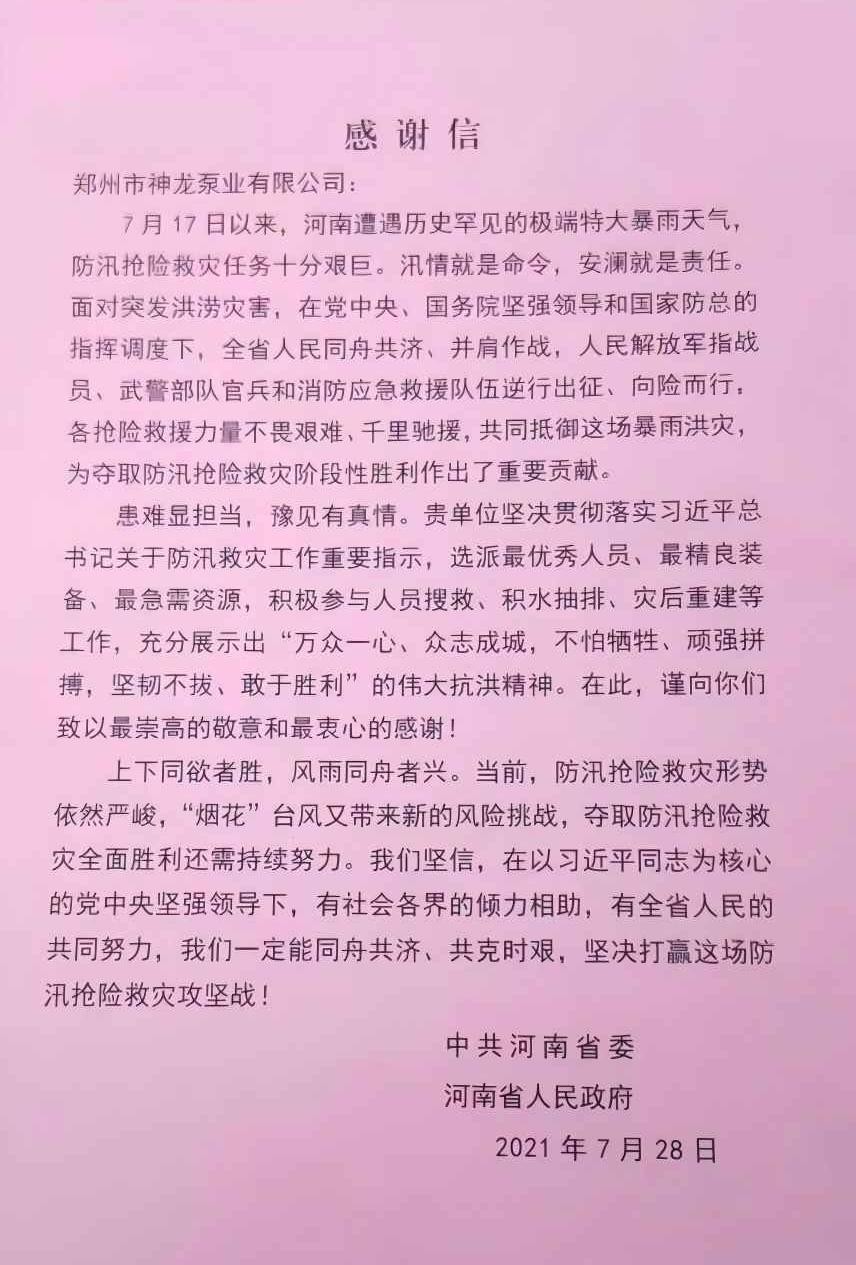 河南省人民政府發(fā)來感謝信